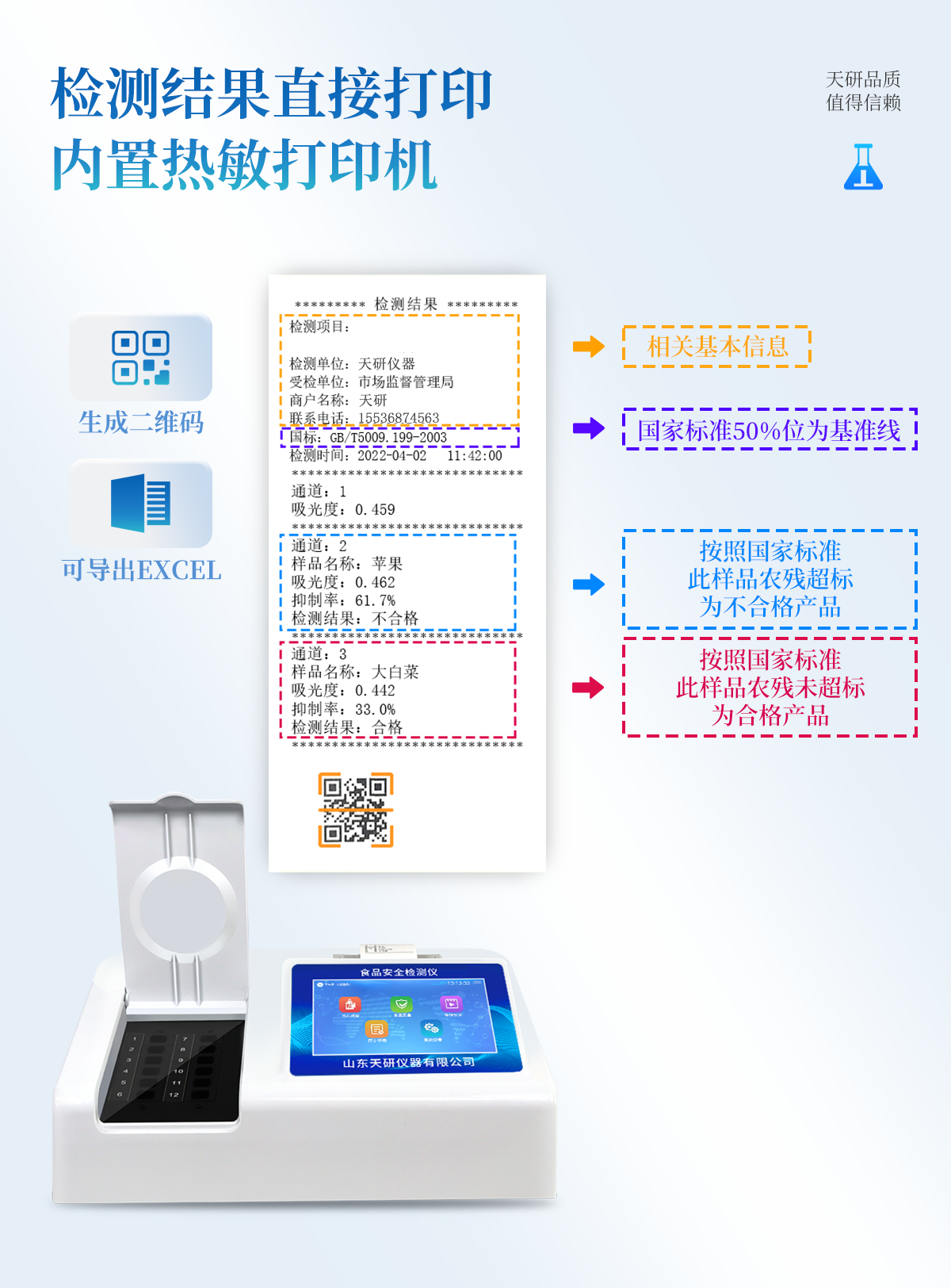 安卓智能操作系統(tǒng),采用更加**和人性化操作,儀器具有網(wǎng)線連接、wifi聯(lián)網(wǎng)上傳、GPRS無(wú)線遠(yuǎn)傳功能,快速上傳數(shù)據(jù)。智能化程度高,儀器具有自檢功能:具有開(kāi)機(jī)自檢和調(diào)零功能,具有自動(dòng)檢測(cè)重復(fù)性功能。檢測(cè)通道:≥12個(gè)檢測(cè)通道,可以同時(shí)測(cè)試多個(gè)樣品,每個(gè)樣品由程序控制分別獨(dú)立工作,不會(huì)互相干擾。顯示方式:≥8英寸液晶觸摸屏顯示,人性化中文操作界面,讀數(shù)直觀、簡(jiǎn)單。配備新一代嵌入式熱敏打印機(jī),可選擇手動(dòng)打印或者自動(dòng)打印,檢測(cè)完成可自動(dòng)打印檢測(cè)報(bào)告和二維碼。光源采用進(jìn)口超高亮發(fā)光二極管,高精度、穩(wěn)定性強(qiáng)、光源可控、可以關(guān)掉不使用的光源,功耗更低。采用USB2.0接口設(shè)計(jì),方便數(shù)據(jù)的存貯和移動(dòng),并可隨時(shí)與計(jì)算機(jī)直接相連,并且可用計(jì)算機(jī)控制儀器。實(shí)現(xiàn)數(shù)據(jù)查詢、瀏覽、分析、統(tǒng)計(jì)、打印等。儀器帶有監(jiān)管平臺(tái)。數(shù)據(jù)可局域網(wǎng)和互聯(lián)網(wǎng)數(shù)據(jù)上傳,檢測(cè)結(jié)果直接傳至食品安全監(jiān)管平臺(tái)。進(jìn)行區(qū)域食品安全監(jiān)管及大數(shù)據(jù)分析處理,檢測(cè)區(qū)域食品安全長(zhǎng)短期動(dòng)態(tài),達(dá)到食品安全問(wèn)題預(yù)估、預(yù)警一體化便攜式快檢設(shè)備,滿足現(xiàn)場(chǎng)及流動(dòng)檢測(cè)使用需求,能夠在同一軟件下實(shí)現(xiàn)所有檢測(cè)項(xiàng)目的檢測(cè),并可通過(guò)同一窗口直觀顯示檢測(cè)結(jié)果。儀器具有多品類多種類樣品菜單庫(kù),可靈活選擇檢測(cè)樣品,不同的檢測(cè)通道可同時(shí)檢測(cè)不同的樣品項(xiàng)目。也可在儀器上直接編輯錄入樣品名稱、檢測(cè)指標(biāo)、送檢單位等信息并保存進(jìn)樣品數(shù)據(jù)庫(kù)。樣品處理簡(jiǎn)單省力,整體操作快速、安全、便捷。儀器具有自身保護(hù)功能,可設(shè)置用戶名及密碼,防止非工作人員操作等。高靈敏度,高檢測(cè)精度,高重復(fù)性精度,掃描式高精度光學(xué)傳感器。儀器具有重新校準(zhǔn)、鎖定、恢復(fù)出廠設(shè)置功能。支持U盤(pán)存儲(chǔ)。 結(jié)果判定線可修改,對(duì)照值標(biāo)定值可保存,斷電不丟失數(shù)據(jù)。