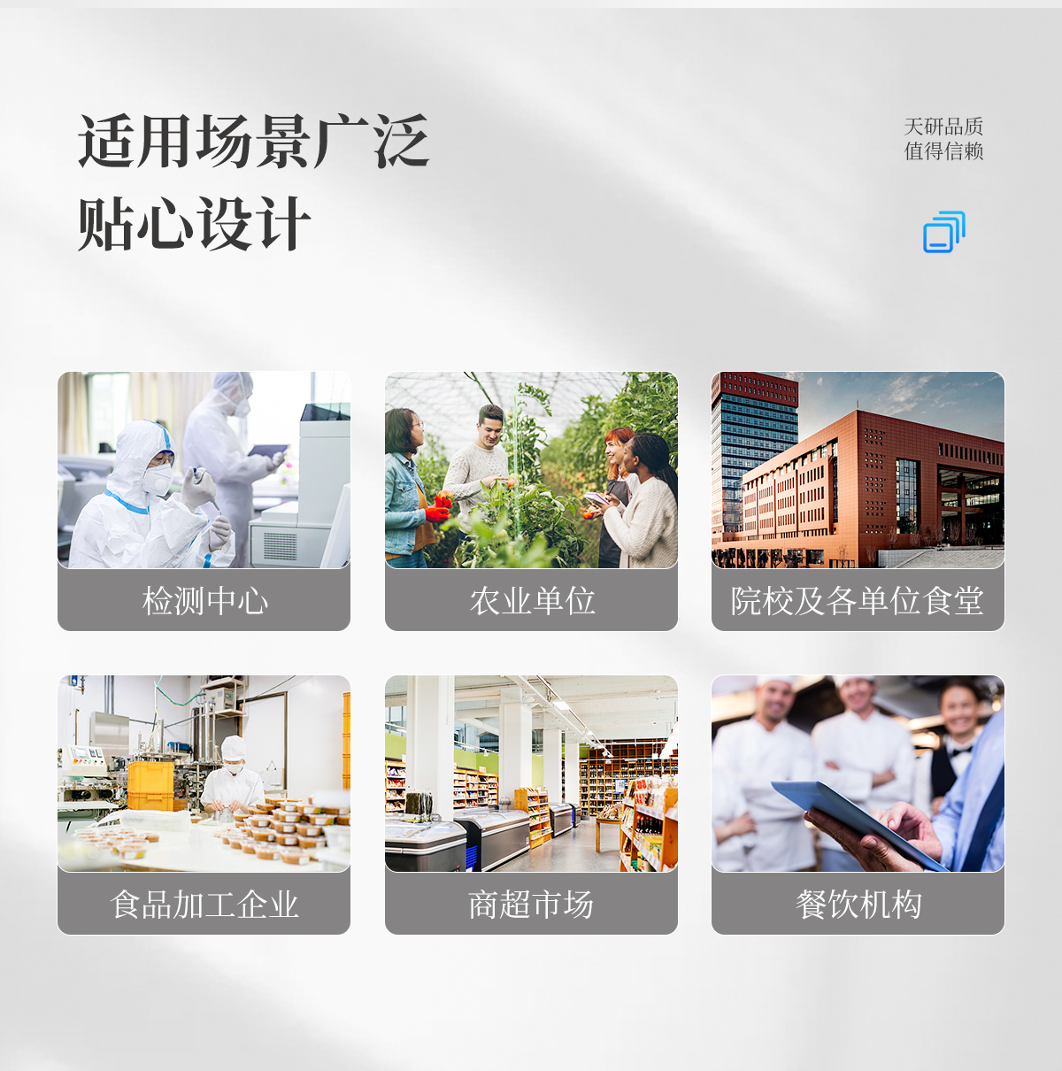 多功能食品安全檢測(cè)儀可快速檢測(cè)200多項(xiàng)目,包含非食用化學(xué)物質(zhì)、濫用食品添加劑、農(nóng)藥殘留、獸藥殘留、重金屬、病害肉、營養(yǎng)強(qiáng)化劑、抗生素類殘留、激素類殘留、真菌毒素類殘留、化學(xué)類殘留等現(xiàn)場(chǎng)的定性定量檢測(cè)。該多功能食品安全檢測(cè)儀為集成化食品安全快速檢測(cè)分析設(shè)備,廣泛應(yīng)用于市場(chǎng)監(jiān)管局、檢測(cè)中心、衛(wèi)生監(jiān)督部門、農(nóng)業(yè)部門、院校及各單位食堂、食品肉產(chǎn)品深加工企業(yè)、商超市場(chǎng)、司法部門、餐飲機(jī)構(gòu)、養(yǎng)殖場(chǎng)、屠宰場(chǎng)、檢驗(yàn)檢疫部門等單位使用。