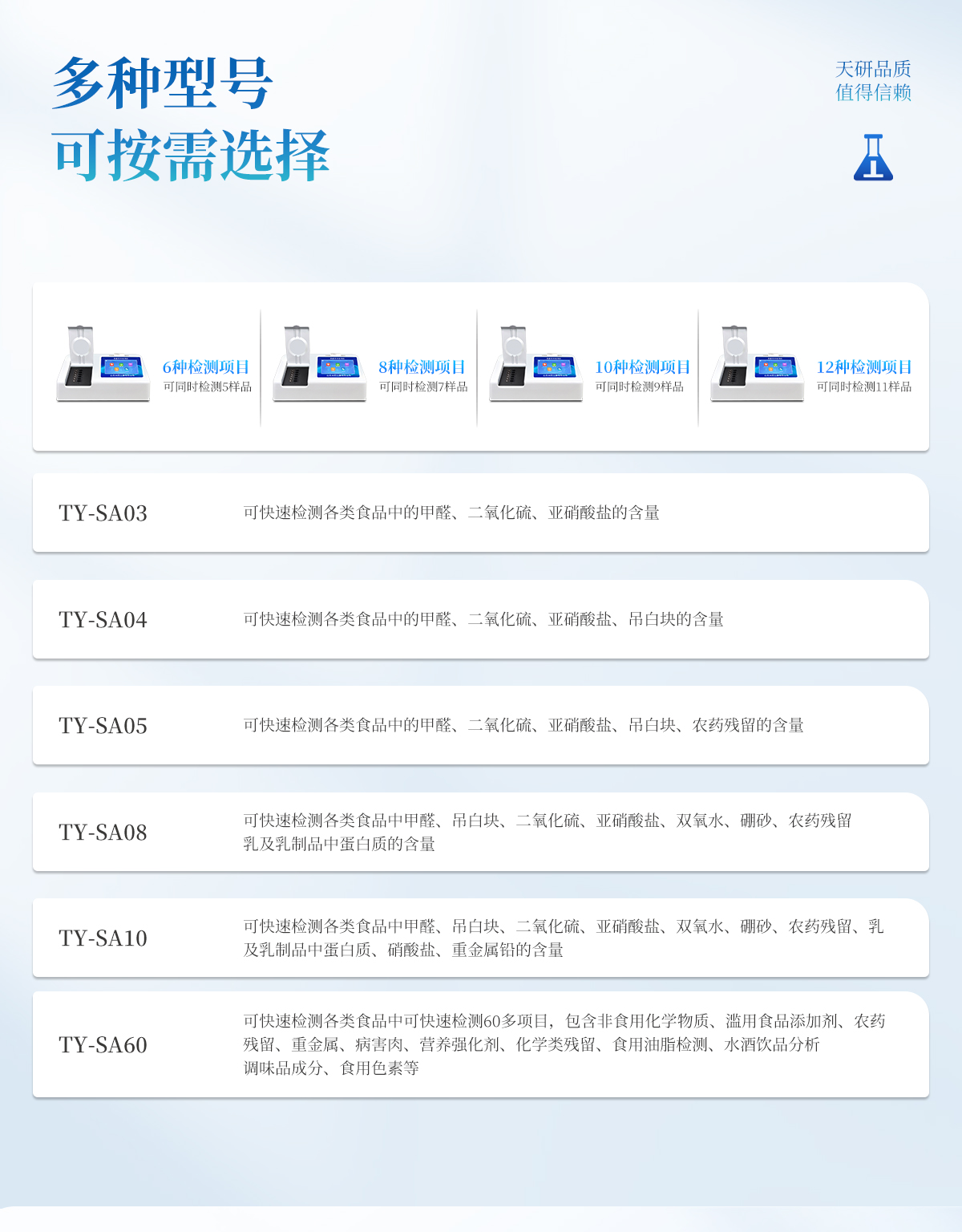 產(chǎn)品描述:產(chǎn)品介紹: 多功能食品安全檢測儀可快速檢測200多項目,包含非食用化學物質、濫用食品添加劑、農(nóng)藥殘留、獸藥殘留、重金屬、病害肉、營養(yǎng)強化劑、抗生素類殘留、激素類殘留、真菌毒素類殘留、化學類殘留等現(xiàn)場的定性定量檢測。該多功能食品安全檢測儀為集成化食品安全快速檢測分析設備,廣泛應用于市場【詳情】