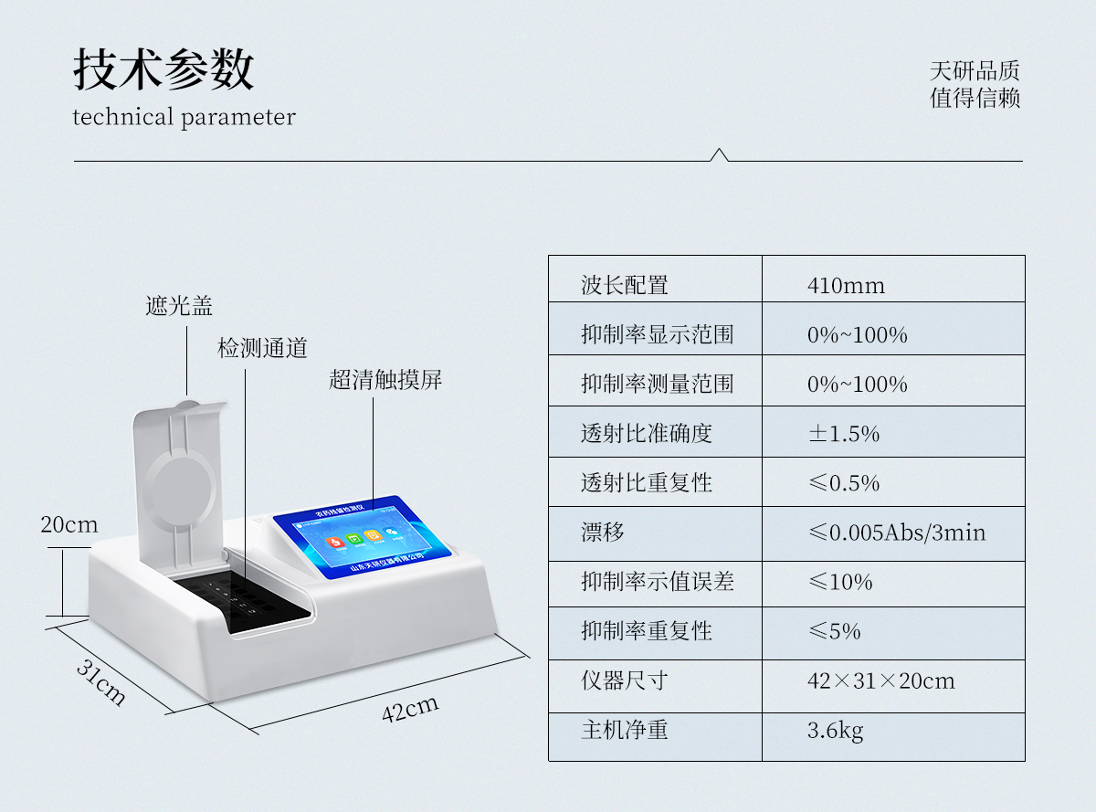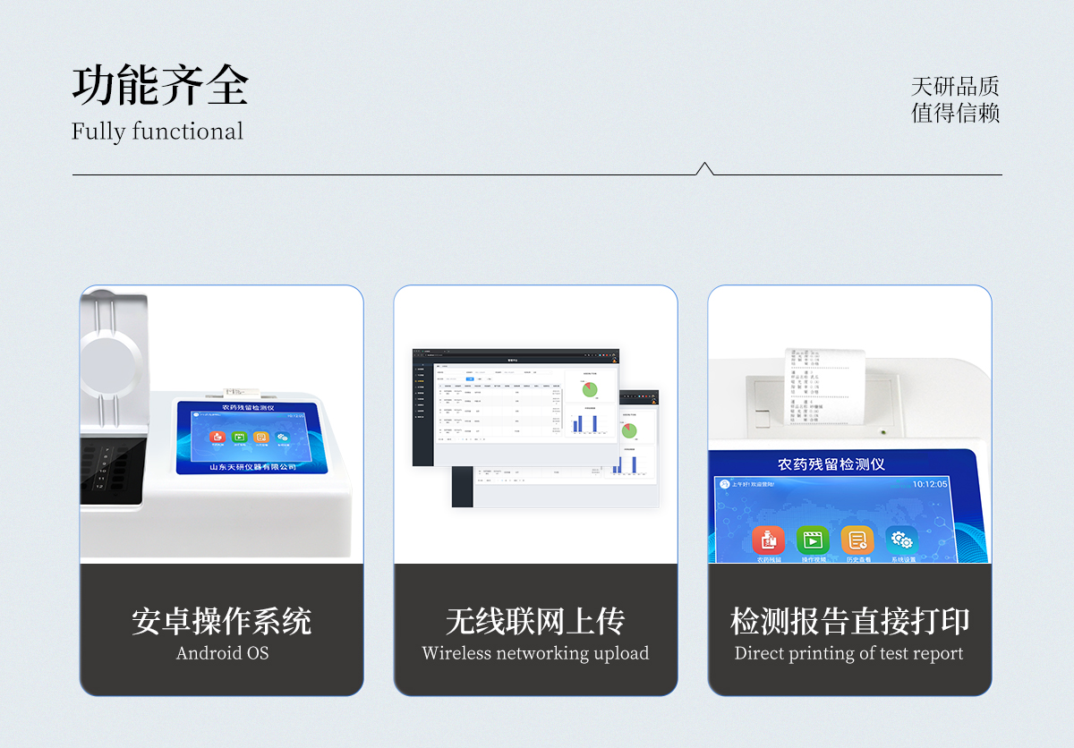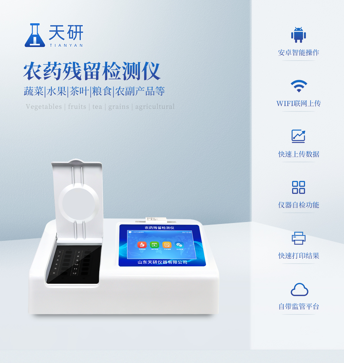 乙酰膽堿酯酶和丁酰膽堿酯酶試劑均可以使用,符合國家標(biāo)準(zhǔn)和農(nóng)業(yè)部標(biāo)準(zhǔn)的要求。自動(dòng)判斷樣品是否合格,檢測(cè)結(jié)果更加直觀。儀器具有100多種蔬菜名稱菜單庫,分類管理,并可按需添加或刪除蔬菜名,編輯蔬菜名稱,可直接打印出蔬菜名稱。檢測(cè)通道:10個(gè)檢測(cè)通道,可以同時(shí)測(cè)試多個(gè)樣品,循環(huán)檢測(cè),即放即檢,每個(gè)樣品由程序控制分別獨(dú)立工作,不會(huì)互相干擾。智能操作系統(tǒng),采用更加人性化操作,主控采用多核處理器,主頻1.88Ghz,運(yùn)轉(zhuǎn)速度更快速,穩(wěn)定性更強(qiáng)。顯示方式:7英寸高靈敏真彩觸摸屏顯示,人性化中文操作界面,讀數(shù)直觀、簡(jiǎn)單。打印機(jī)采用串口5v打印,可選擇手動(dòng)打印或者自動(dòng)打印,三分鐘出打印結(jié)果,打印格式為檢測(cè)人姓名、吸光度差值、檢測(cè)時(shí)間、檢測(cè)機(jī)構(gòu)、樣品名稱及結(jié)果判定。光源采用進(jìn)口超高亮發(fā)光二極管,具有低功耗、高精度、穩(wěn)定性強(qiáng)、光源可控可以關(guān)掉不使用的光源,響應(yīng)速度快等優(yōu)點(diǎn)。智能恒流穩(wěn)壓,光強(qiáng)自動(dòng)校準(zhǔn),長時(shí)間連續(xù)工作光源無溫漂現(xiàn)象。儀器具有GPRS遠(yuǎn)傳功能,可插手機(jī)卡實(shí)現(xiàn)數(shù)據(jù)遠(yuǎn)傳平臺(tái),wifi聯(lián)網(wǎng)功能,可將數(shù)據(jù)快速上傳電腦,進(jìn)行數(shù)據(jù)管理與統(tǒng)計(jì)。采用USB2.0接口設(shè)計(jì),方便數(shù)據(jù)的存貯和移動(dòng),并可隨時(shí)與計(jì)算機(jī)直接相連,并且可用計(jì)算機(jī)控制儀器。實(shí)現(xiàn)數(shù)據(jù)查詢、瀏覽、分析、統(tǒng)計(jì)、打印等。智能化程度高,儀器具有自檢功能:具有開機(jī)自檢和調(diào)零功能,具有自動(dòng)檢測(cè)重復(fù)性功能儀器具有自身保護(hù)功能,可設(shè)置用戶名及密碼,防止非工作人員操作等。采用DC12v直流供電,安全系統(tǒng)更高,并且配備6A鋰電池充電器。儀器具有重新校準(zhǔn)、鎖定、恢復(fù)出廠設(shè)置功能。