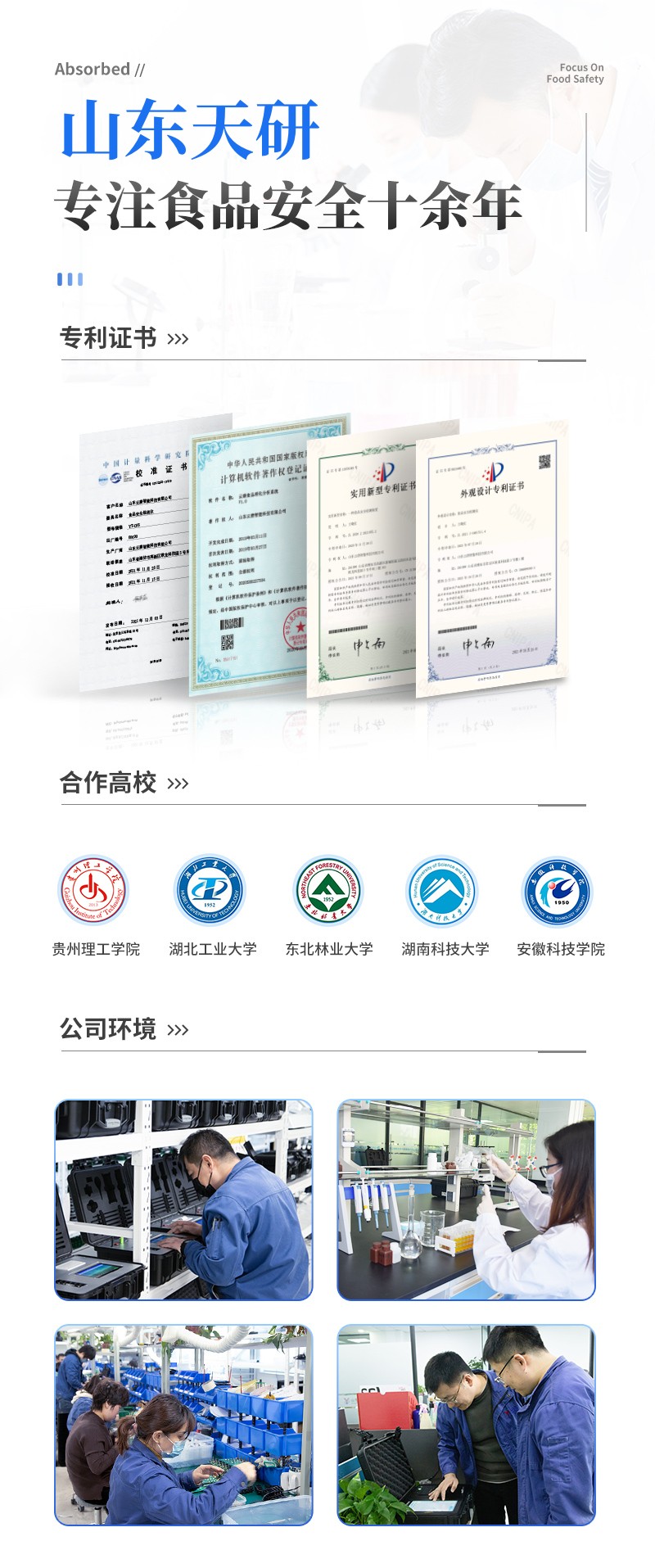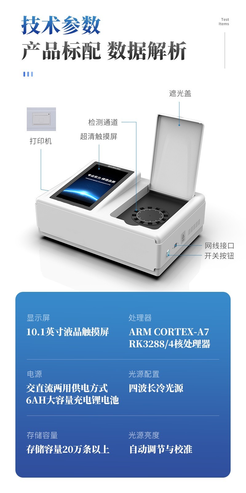 | 儀器采用臺式一體化系統(tǒng)檢測技術(shù),將分光光度模塊、新型農(nóng)殘檢測模塊、數(shù)字化管理模塊、無線通訊模塊高度集成于一體,支持檢測200種食品安全檢測項目,同時預(yù)留升級檢測方法。 | 儀器檢測模塊標(biāo)準(zhǔn)化、智能化,可隨意自由組合。檢測箱體內(nèi)置多個標(biāo)準(zhǔn)檢測單元,檢測模塊可以調(diào)整配置。 | 儀器采用全新安卓智能系統(tǒng),主控芯片采用 ARM Cortex-A7,RK3288/4核處理器,10.1寸高清液晶觸摸豎屏,更加**的UI交互界面,運轉(zhuǎn)快捷;儀器配備無線通信模塊: 4G(APN)通訊模塊、Wifi模塊,藍(lán)牙傳輸,同時具有雙USB接口以及RJ45接口能以多種方式實現(xiàn)數(shù)據(jù)保存和數(shù)據(jù)傳輸功能。 | 創(chuàng)新檢測模式: | ★檢測通道:≥12通道;采用精密旋轉(zhuǎn)比色池設(shè)計,使用同芯片同光源校準(zhǔn)精度,解決不同光源之間的誤差值。1-12通道間誤差0.1%。(**號:ZL202022821055.2) | ★儀器具有自動識別比色皿檢測功能,即:將樣品比色皿放入儀器后,點擊樣品檢測,儀器自動識別比色皿進行通道檢測。 | 進口高精光源: | 高精度進口四波長冷光源,通道配置 410、520、590、630nm 波長光源,一個光源芯片驅(qū)動一個光源,誤差極小,每臺設(shè)備單獨**校準(zhǔn)光源,**比對,同時參照四種不同波段光源全方位覆蓋市面上99%的農(nóng)殘食品項目檢測。 | 智能化操作系統(tǒng): | 便捷操作系統(tǒng):設(shè)備檢測時可在同一檢測界面自動對應(yīng)相關(guān)檢測通道一次性選擇1-12個樣品名稱,無須退出界面,節(jié)省操作時間。 | 數(shù)據(jù)集成系統(tǒng):設(shè)備首頁自動統(tǒng)計檢測數(shù)據(jù)包含:周檢測數(shù)據(jù)、月檢測數(shù)據(jù),全部檢測總數(shù)量,均包含檢測總數(shù),合格數(shù),不合格數(shù),以及相關(guān)柱形分析圖,對各項檢測數(shù)據(jù)清晰掌握,無需電腦查詢,更加快捷直觀。 | 項目預(yù)設(shè)系統(tǒng):支持添加單個及多個相同或不相同的任務(wù)預(yù)設(shè),一鍵快速調(diào)取,每一個任務(wù)分別可以設(shè)置不同的樣品、批次、編號、來源、備注、抽樣信息、檢測信息、受檢信息、復(fù)核信息等更多信息。無縫鏈接平臺和APP實時查看下發(fā)任務(wù)。 | 數(shù)據(jù)監(jiān)管系統(tǒng):同步對接監(jiān)管平臺,數(shù)據(jù)可局域網(wǎng)和互聯(lián)網(wǎng)數(shù)據(jù)上傳,檢測結(jié)果可選擇直接傳至食品安全監(jiān)管平臺。集成OSS輸出存儲服務(wù)、區(qū)分設(shè)備定向管理應(yīng)用,進行區(qū)域食品安全監(jiān)管及大數(shù)據(jù)分析處理與數(shù)據(jù)統(tǒng)計,檢測區(qū)域食品安全長短期動態(tài),達到食品安全問題預(yù)估、預(yù)警。 | 自定義打印系統(tǒng):內(nèi)置全新打印系統(tǒng),新創(chuàng)自定義打印方式,可按需靈活設(shè)置開啟或關(guān)閉:產(chǎn)品合格證(國家農(nóng)業(yè)部標(biāo)準(zhǔn)要求),二維碼,抽樣信息、檢測信息,受檢信息、復(fù)核信息、抽樣日期、檢測日期等信息的打印。 | 系統(tǒng)遠(yuǎn)程更新功能:可定向分客戶分儀器更新系統(tǒng),按照不同客戶后期實際需求添加項目,無需機器返廠,即可遠(yuǎn)程實時升級全新系統(tǒng),節(jié)省時間成本及避免運輸造成設(shè)備損壞。 | 儀器主機采用一體化防水、抗壓、防撞擊、防腐蝕箱體設(shè)計,同時配備交直流供電,可連接車載電源,可選配大容量充電鋰電池,滿足現(xiàn)場野外檢測需求。 | 安全證書,放心保障:儀器具有中國計量科學(xué)研究院校準(zhǔn)證書,**認(rèn)證。 |