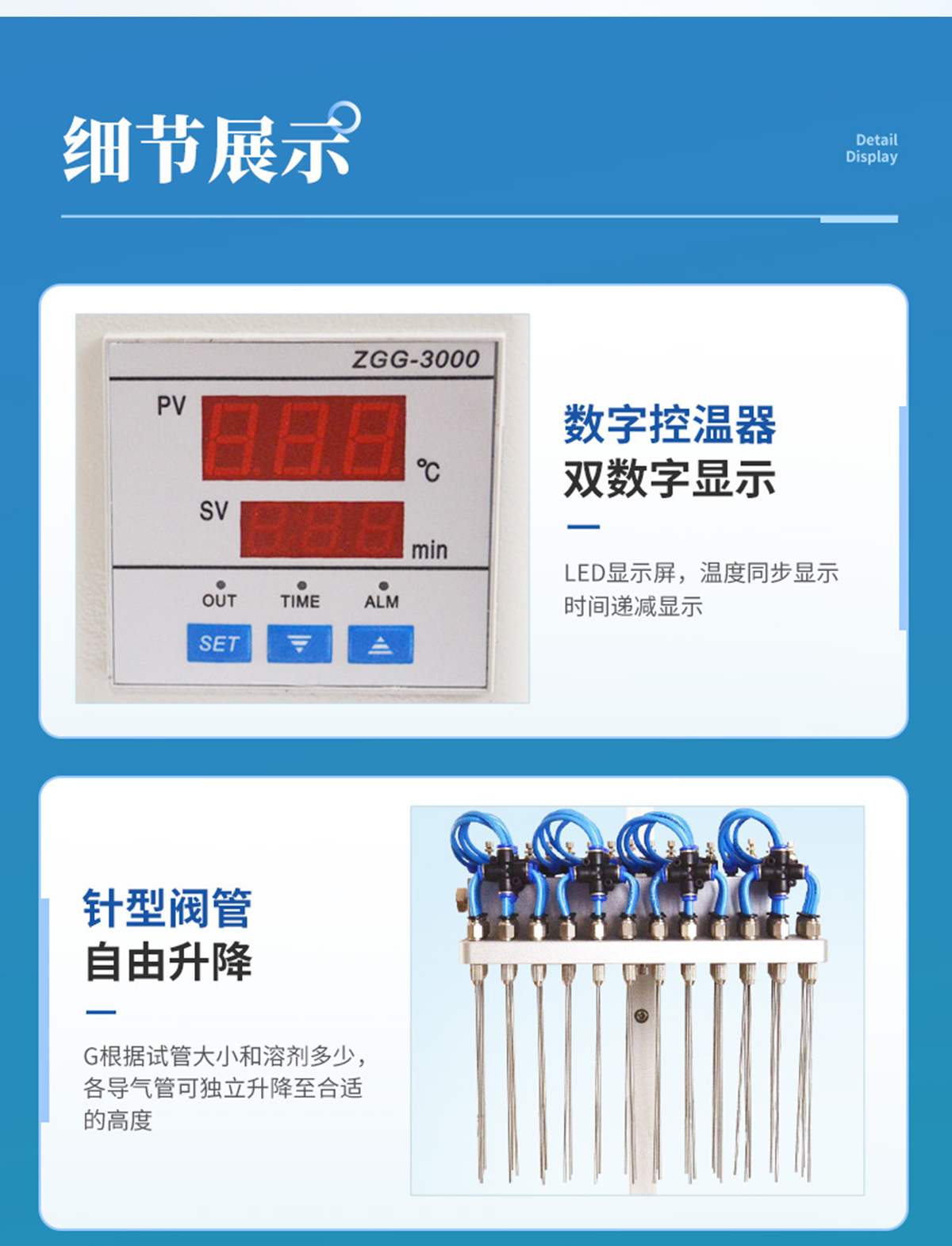 圓形水浴氮吹儀適用于試管、錐形瓶、離心管等不同規(guī)格的容器。樣品位數(shù):12位/24位,彈簧試管夾的樣品架固定定位,每個樣品都有數(shù)字編號。試管通過帶彈簧的試管夾和支撐盤來固定位置,可任意調(diào)節(jié)高度方向。自由升降的針型閥管,根據(jù)試管大小和溶劑多少,各導(dǎo)氣管可獨立升降至合適的高度,同時可調(diào)的針型閥能管控制氣體流量。圓形結(jié)構(gòu),轉(zhuǎn)動自如,方便樣品支架進出水浴,操作方便。智能數(shù)字溫控器,可定時,雙數(shù)字顯示,調(diào)節(jié)采用PID技術(shù)并可實現(xiàn)超溫報警及防干燒。圓形氮吹儀的所有部件均勻不銹鋼制造,可耐酸堿等有機溶劑。調(diào)節(jié)閥:保證良好的氣密性,經(jīng)久耐用。在濃縮有毒溶劑時,整個系統(tǒng)可置于通風柜中。