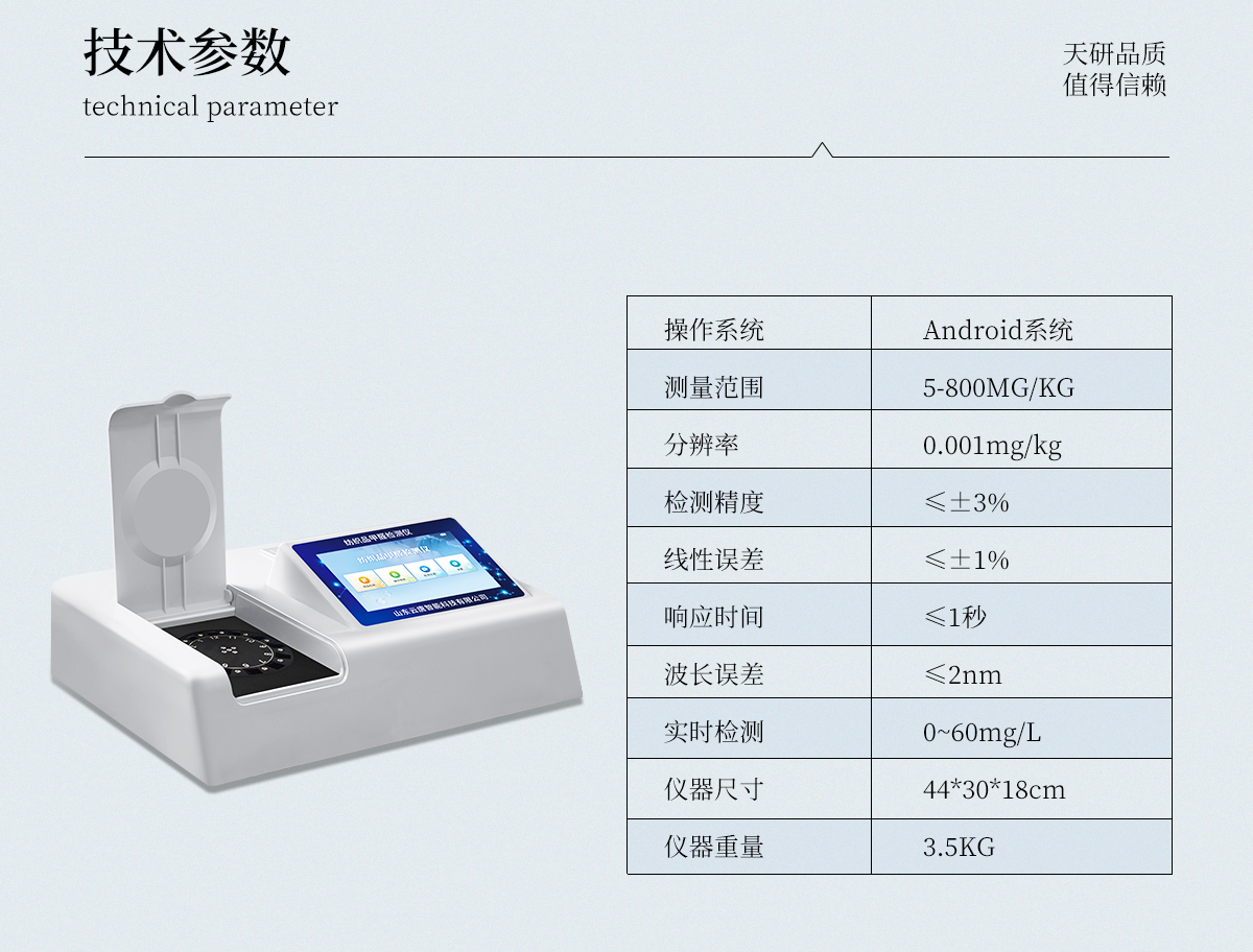 1、智能**且方便①智能芯片:主控芯片采用ARM Cortex-A7,RK3288/4核處理器,搭配安卓智能操作系統(tǒng),集實(shí)驗(yàn)操作,分析結(jié)果,打印報(bào)告等功能于一體,使用方便,性能更強(qiáng)。②大屏顯示:采用10.1英寸液晶觸摸屏,單機(jī)即可操作,無(wú)需連接外部顯示或控制器。③多樣同檢:儀器具有12個(gè)檢測(cè)通道,可同時(shí)一次性檢測(cè)11個(gè)樣品,效率更高。④工作預(yù)設(shè):具有任務(wù)預(yù)設(shè)模塊,一鍵提前預(yù)設(shè)樣品所有信息內(nèi)容。來(lái)樣時(shí)可直接檢測(cè),同時(shí)可多次調(diào)取。⑤數(shù)據(jù)分析:設(shè)備首頁(yè)自動(dòng)匯總分析數(shù)據(jù),并繪制柱形分析圖,各項(xiàng)檢測(cè)數(shù)據(jù)一目了然,快捷直觀。⑥高度集成:模塊高度集合,將分光光度模塊、數(shù)字化管理模塊、無(wú)線通訊模塊集成于一體。可將檢測(cè)結(jié)果進(jìn)行分析,直接上傳至數(shù)據(jù)平臺(tái),實(shí)現(xiàn)數(shù)據(jù)共享,方便后期進(jìn)行數(shù)據(jù)分析與統(tǒng)計(jì)。⑦遠(yuǎn)程升級(jí):儀器具備遠(yuǎn)程升級(jí)功能,可遠(yuǎn)程升級(jí)程序,無(wú)需返廠,并可持續(xù)性免費(fèi)更新系統(tǒng)版本,降低成本及運(yùn)輸損耗風(fēng)險(xiǎn)。2、檢測(cè)精準(zhǔn)且直觀①**技術(shù):精密旋轉(zhuǎn)比色池,使用同芯片同光源校準(zhǔn)精度,解決不同光源之間存在波長(zhǎng)誤差的問(wèn)題,更加準(zhǔn)確**。②結(jié)果直觀:儀器自動(dòng)對(duì)檢測(cè)結(jié)果與國(guó)標(biāo)限量值進(jìn)行對(duì)比,自動(dòng)判定結(jié)果是否合格,結(jié)果更直觀。3、功能強(qiáng)大且實(shí)用①存儲(chǔ)功能:設(shè)備可以存儲(chǔ)數(shù)據(jù)100000組,可在屏幕上直觀查看歷史數(shù)據(jù),可導(dǎo)出數(shù)據(jù)。②打印功能:設(shè)備自帶打印功能,可對(duì)樣品信息及檢測(cè)結(jié)果無(wú)限次隨意打印。③全新方式:新創(chuàng)自定義打印方式,可按需靈活勾選控制:二維碼,抽樣信息、檢測(cè)信息,受檢信息、復(fù)核信息、抽樣日期、檢測(cè)日期等信息的打印④多重編輯:樣品信息可多重編輯,可以對(duì)每個(gè)通道屬性和樣品信息單獨(dú)進(jìn)行編輯,例如樣品信息、抽樣信息、檢測(cè)信息,受檢信息、復(fù)核信息、抽樣日期、檢測(cè)日期等信息等。⑤雙語(yǔ)設(shè)計(jì):全中文/英文操作菜單,簡(jiǎn)單實(shí)用,適用于不同用戶的需求。