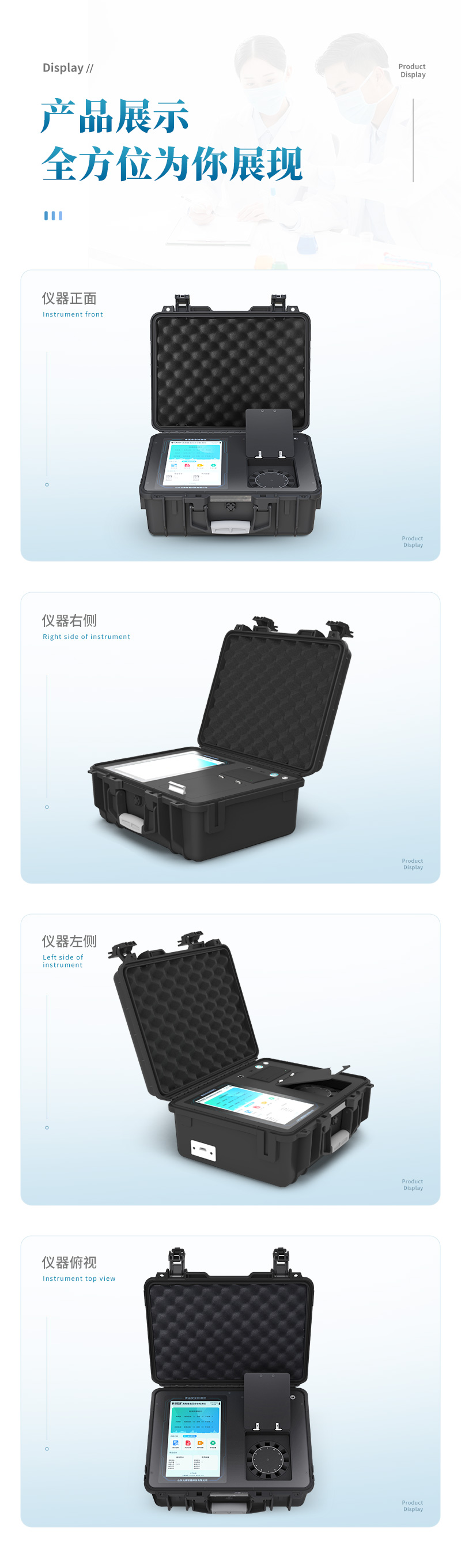 儀器采用手提式一體化系統(tǒng)檢測技術(shù),將分光光度模塊、膠體金檢測模塊、新型農(nóng)殘檢測模塊、數(shù)字化管理模塊、無線通訊模塊高度集成于一體,支持檢測200種食品安全檢測項(xiàng)目,同時(shí)預(yù)留升級(jí)檢測方法。儀器檢測模塊標(biāo)準(zhǔn)化、智能化,檢測項(xiàng)目可隨意自由組合。檢測箱體內(nèi)置多個(gè)標(biāo)準(zhǔn)檢測單元,檢測模塊可以調(diào)整配置。顯示屏幕:儀器采用10.1英寸豎向液晶觸摸屏顯,搭配運(yùn)行安卓智能操作系統(tǒng),主控芯片采用ARM Cortex-A7,RK3288/4核處理器,主頻1.88Ghz,操作方便,性能更強(qiáng)。檢測通道:≥12通道;采用精密旋轉(zhuǎn)比色池設(shè)計(jì),使用同芯片同光源校準(zhǔn)精度,解決不同光源之間的誤差值,更加準(zhǔn)確**。(1-12通道間誤差0.1%,**號(hào):ZL202022821055.2)儀器光源:高精度進(jìn)口四波長冷光源,每個(gè)通道均配置 410、520、590、630nm 波長光源,標(biāo)配**的光路切換裝置,**光路切換功能可實(shí)現(xiàn)64波長,并且所有檢測項(xiàng)目可實(shí)現(xiàn)所有通道同時(shí)檢測。設(shè)備可一鍵校準(zhǔn),自動(dòng)保存校準(zhǔn)數(shù)據(jù),自動(dòng)對(duì)比校驗(yàn),得到精準(zhǔn)光源,采用Android SP存儲(chǔ)數(shù)據(jù),光源數(shù)據(jù)永不丟失,方便每一次使用。通訊接口:配備無線通信模塊、4G(APN)通訊模塊、藍(lán)牙傳輸,同時(shí)具有雙USB接口以及RJ45網(wǎng)線接口,可以多方式實(shí)現(xiàn)數(shù)據(jù)保存及數(shù)據(jù)傳輸存儲(chǔ)方式:支持U盤存儲(chǔ),標(biāo)準(zhǔn)USB接口,免驅(qū)動(dòng)安裝。檢測結(jié)果存儲(chǔ)容量20萬條以上,可生成Excel表格進(jìn)行拷貝,并具有登錄保護(hù)功能。智能化操作系統(tǒng):1)操作系統(tǒng):儀器可在同一檢測界面自動(dòng)對(duì)應(yīng)相關(guān)檢測通道,一次性選擇1-12個(gè)樣品名稱,無需退出界面,節(jié)省操作時(shí)間。并可以對(duì)每個(gè)通道屬性和樣品信息單獨(dú)進(jìn)行編輯,例如送檢單位、人員,檢測人員等,打印時(shí)勾選打印顯示。2)數(shù)據(jù)集成系統(tǒng):設(shè)備首頁自動(dòng)匯總分析檢測數(shù)據(jù),包含:周檢測數(shù)據(jù)、月檢測數(shù)據(jù),全部檢測總數(shù)量,均包含檢測總數(shù),合格數(shù),不合格數(shù),以及相關(guān)柱形分析圖,各項(xiàng)檢測數(shù)據(jù)一目了然,無需電腦查詢,更加快捷直觀。3)數(shù)據(jù)庫系統(tǒng):十幾項(xiàng)數(shù)據(jù)庫分類管理儀器:包含項(xiàng)目類型、項(xiàng)目數(shù)據(jù)、檢測數(shù)據(jù)、歷史記錄、國標(biāo)信息、曲線信息、采樣信息、檢測信息、受檢信息、復(fù)核信息、圖表信息、光源校準(zhǔn)信息、打印樣式信息、樣品庫信息等等,數(shù)據(jù)庫之間互相協(xié)調(diào)聯(lián)動(dòng)保證數(shù)據(jù)的真實(shí)完整性。同時(shí)產(chǎn)品數(shù)據(jù)庫以及歷史檢測記錄支持一鍵檢索功能。4)限量規(guī)判系統(tǒng):具有限量查詢、添加物質(zhì)合規(guī)判定系統(tǒng)。檢測出結(jié)果后,系統(tǒng)自動(dòng)調(diào)用系統(tǒng)數(shù)據(jù)庫中相關(guān)國標(biāo)進(jìn)行比對(duì)判定,客觀顯示判定結(jié)果是否合格。5)項(xiàng)目預(yù)設(shè)系統(tǒng):儀器具有任務(wù)預(yù)設(shè)模塊,一鍵提前預(yù)設(shè),給出方便快捷的新檢測方案,每一個(gè)任務(wù)分別可以設(shè)置不同的樣品、批次、編號(hào)、來源、備注、抽樣信息、檢測信息、受檢信息、復(fù)核信息等更多信息。樣品送檢時(shí)一鍵調(diào)取保存信息,并可多次調(diào)取,大大提高檢測效率。6)數(shù)據(jù)監(jiān)管系統(tǒng):同步對(duì)接監(jiān)管平臺(tái),數(shù)據(jù)可局域網(wǎng)和互聯(lián)網(wǎng)數(shù)據(jù)上傳,檢測結(jié)果可選擇直接傳至食品安全監(jiān)管平臺(tái)。進(jìn)行區(qū)域食品安全監(jiān)管及大數(shù)據(jù)分析處理與數(shù)據(jù)統(tǒng)計(jì),檢測區(qū)域食品安全長短期動(dòng)態(tài),達(dá)到食品安全問題預(yù)估、預(yù)警。7)打印系統(tǒng):內(nèi)置全新打印機(jī),新創(chuàng)自定義打印方式,可按需靈活勾選控制:產(chǎn)品合格證(國家農(nóng)業(yè)部標(biāo)準(zhǔn)要求),二維碼,抽樣信息、檢測信息,受檢信息、復(fù)核信息、抽樣日期、檢測日期等信息的打印。供電模式:儀器交直流兩用,直流12V供電,可連接車載電源,可配6ah大容量充電鋰電池,電量可實(shí)時(shí)顯示,方便戶外流動(dòng)測試。膠體金檢測模塊:采用雙通道CMOS成像處理技術(shù)及膠體金免疫層析技術(shù),可同時(shí)讀取雙膠體金卡數(shù)據(jù),自動(dòng)采集、處理分析,將檢測結(jié)果顯示,并可根據(jù)參考限值自動(dòng)判斷檢測結(jié)果,可檢測常見的獸藥殘留、生物毒素、抗生素、違禁添加物等。1)探測技術(shù):CMOS成像探測;2)檢測通道:1個(gè)通道;3)檢測方式:消線法和比色法;4)顯示模式:陰性或陽性;5)曲線形式:軌道式掃描方式,顯示金標(biāo)卡圖像,實(shí)時(shí)生成、識(shí)別CT曲線圖,無需手動(dòng)調(diào)整,完成檢測后自動(dòng)退出檢測卡。兼容市場上其他金標(biāo)卡,使用耗材不受限制。儀器加入遠(yuǎn)程升級(jí)功能,可定向分客戶分儀器更新,開機(jī)后自動(dòng)更新,客戶無需任何操