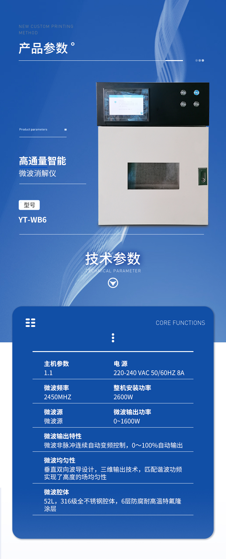 產(chǎn)品描述:產(chǎn)品說(shuō)明:TY-WB20高通量智能微波消解儀為樣品提供了快速,安全,自動(dòng)化的解決方案,在高壓條件下加快樣品消解反應(yīng)的速度,廣泛應(yīng)用于食品、環(huán)境保護(hù)、疾病控制、質(zhì)量監(jiān)督、商品檢驗(yàn)、科研院所等領(lǐng)域。產(chǎn)品特點(diǎn):儀器采用微波非脈沖連續(xù)自動(dòng)變頻控制,延長(zhǎng)了儀器的使用壽命和電磁波的均勻性,腔體采用52L大容積316L不銹鋼腔【詳情】
