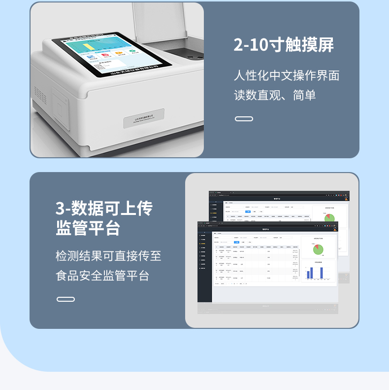 | 儀器采用臺(tái)式一體化系統(tǒng)檢測(cè)技術(shù),將分光光度模塊、新型農(nóng)殘檢測(cè)模塊、數(shù)字化管理模塊、無(wú)線通訊模塊高度集成于一體,支持檢測(cè)200種食品安全檢測(cè)項(xiàng)目,同時(shí)預(yù)留升級(jí)檢測(cè)方法。 | 儀器檢測(cè)模塊標(biāo)準(zhǔn)化、智能化,可隨意自由組合。檢測(cè)箱體內(nèi)置多個(gè)標(biāo)準(zhǔn)檢測(cè)單元,檢測(cè)模塊可以調(diào)整配置。 | 儀器采用全新安卓智能系統(tǒng),主控芯片采用 ARM Cortex-A7,RK3288/4核處理器,10.1寸高清液晶觸摸豎屏,更加**的UI交互界面,運(yùn)轉(zhuǎn)快捷;儀器配備無(wú)線通信模塊: 4G(APN)通訊模塊、Wifi模塊,藍(lán)牙傳輸,同時(shí)具有雙USB接口以及RJ45接口能以多種方式實(shí)現(xiàn)數(shù)據(jù)保存和數(shù)據(jù)傳輸功能。 | 創(chuàng)新檢測(cè)模式: | ★檢測(cè)通道:≥12通道;采用精密旋轉(zhuǎn)比色池設(shè)計(jì),使用同芯片同光源校準(zhǔn)精度,解決不同光源之間的誤差值。1-12通道間誤差0.1%。(**號(hào):ZL202022821055.2) | ★儀器具有自動(dòng)識(shí)別比色皿檢測(cè)功能,即:將樣品比色皿放入儀器后,點(diǎn)擊樣品檢測(cè),儀器自動(dòng)識(shí)別比色皿進(jìn)行通道檢測(cè)。 | 進(jìn)口高精光源: | 高精度進(jìn)口四波長(zhǎng)冷光源,通道配置 410、520、590、630nm 波長(zhǎng)光源,一個(gè)光源芯片驅(qū)動(dòng)一個(gè)光源,誤差極小,每臺(tái)設(shè)備單獨(dú)**校準(zhǔn)光源,**比對(duì),同時(shí)參照四種不同波段光源全方位覆蓋市面上99%的農(nóng)殘食品項(xiàng)目檢測(cè)。 | 智能化操作系統(tǒng): | 便捷操作系統(tǒng):設(shè)備檢測(cè)時(shí)可在同一檢測(cè)界面自動(dòng)對(duì)應(yīng)相關(guān)檢測(cè)通道一次性選擇1-12個(gè)樣品名稱,無(wú)須退出界面,節(jié)省操作時(shí)間。 | 數(shù)據(jù)集成系統(tǒng):設(shè)備首頁(yè)自動(dòng)統(tǒng)計(jì)檢測(cè)數(shù)據(jù)包含:周檢測(cè)數(shù)據(jù)、月檢測(cè)數(shù)據(jù),全部檢測(cè)總數(shù)量,均包含檢測(cè)總數(shù),合格數(shù),不合格數(shù),以及相關(guān)柱形分析圖,對(duì)各項(xiàng)檢測(cè)數(shù)據(jù)清晰掌握,無(wú)需電腦查詢,更加快捷直觀。 | 項(xiàng)目預(yù)設(shè)系統(tǒng):支持添加單個(gè)及多個(gè)相同或不相同的任務(wù)預(yù)設(shè),一鍵快速調(diào)取,每一個(gè)任務(wù)分別可以設(shè)置不同的樣品、批次、編號(hào)、來(lái)源、備注、抽樣信息、檢測(cè)信息、受檢信息、復(fù)核信息等更多信息。無(wú)縫鏈接平臺(tái)和APP實(shí)時(shí)查看下發(fā)任務(wù)。 | 數(shù)據(jù)監(jiān)管系統(tǒng):同步對(duì)接監(jiān)管平臺(tái),數(shù)據(jù)可局域網(wǎng)和互聯(lián)網(wǎng)數(shù)據(jù)上傳,檢測(cè)結(jié)果可選擇直接傳至食品安全監(jiān)管平臺(tái)。集成OSS輸出存儲(chǔ)服務(wù)、區(qū)分設(shè)備定向管理應(yīng)用,進(jìn)行區(qū)域食品安全監(jiān)管及大數(shù)據(jù)分析處理與數(shù)據(jù)統(tǒng)計(jì),檢測(cè)區(qū)域食品安全長(zhǎng)短期動(dòng)態(tài),達(dá)到食品安全問(wèn)題預(yù)估、預(yù)警。 | 自定義打印系統(tǒng):內(nèi)置全新打印系統(tǒng),新創(chuàng)自定義打印方式,可按需靈活設(shè)置開(kāi)啟或關(guān)閉:產(chǎn)品合格證(國(guó)家農(nóng)業(yè)部標(biāo)準(zhǔn)要求),二維碼,抽樣信息、檢測(cè)信息,受檢信息、復(fù)核信息、抽樣日期、檢測(cè)日期等信息的打印。 | 系統(tǒng)遠(yuǎn)程更新功能:可定向分客戶分儀器更新系統(tǒng),按照不同客戶后期實(shí)際需求添加項(xiàng)目,無(wú)需機(jī)器返廠,即可遠(yuǎn)程實(shí)時(shí)升級(jí)全新系統(tǒng),節(jié)省時(shí)間成本及避免運(yùn)輸造成設(shè)備損壞。 | 儀器主機(jī)采用一體化防水、抗壓、防撞擊、防腐蝕箱體設(shè)計(jì),同時(shí)配備交直流供電,可連接車載電源,可選配大容量充電鋰電池,滿足現(xiàn)場(chǎng)野外檢測(cè)需求。 | 安全證書(shū),放心保障:儀器具有中國(guó)計(jì)量科學(xué)研究院校準(zhǔn)證書(shū),**認(rèn)證。 |