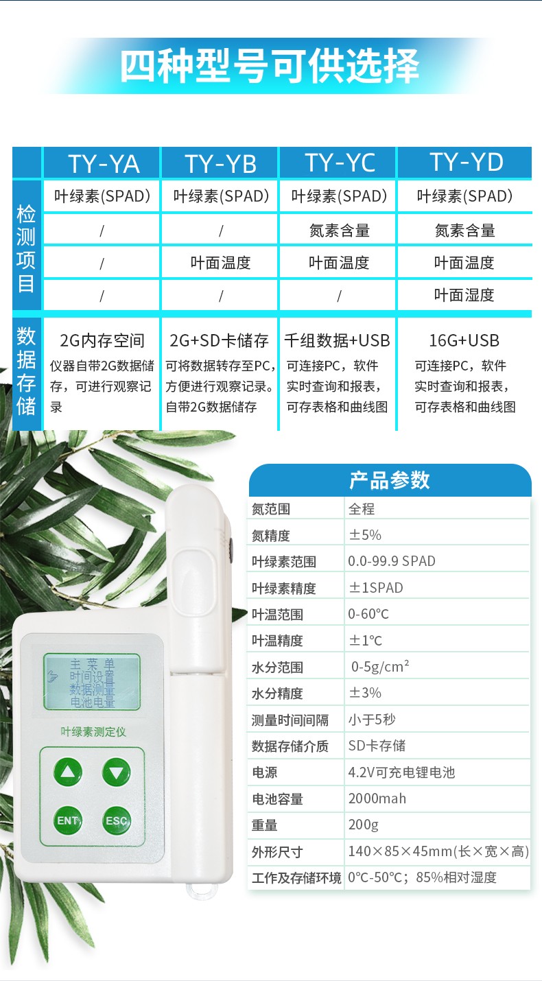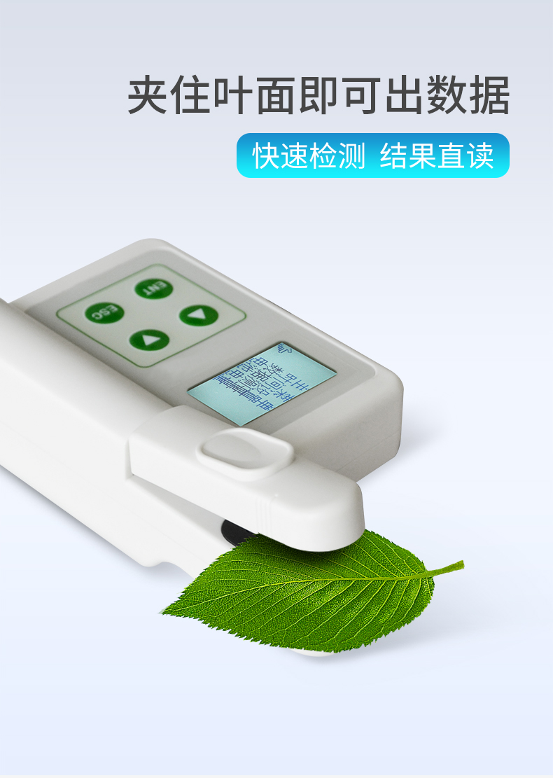 氮素含量一般情況下直接反應(yīng)作物的健康情況,生長狀態(tài)、了解植物真實(shí)的硝基需求量和土壤硝基的缺乏程度或是否過多地施加了氮肥,廣泛應(yīng)用于氮肥管理,除草劑應(yīng)用,葉片衰老,環(huán)境脅迫等研究,葉綠素測量儀在農(nóng)業(yè)種植過程中有很大的意義。 葉 綠素含量的測定結(jié)果是SPAD值,是葉片在兩種波長650nm 和940nm,葉片傳輸光的數(shù)量進(jìn)行比值計(jì)算,來確定葉片當(dāng)前葉綠素的相對數(shù)量(兩種波長范圍內(nèi)的透光系數(shù)來確定葉片當(dāng)前葉綠素的相對數(shù)量 ),SPAD值與葉綠素之間成正比關(guān)系,因此SPAD值往往間接地可代表葉綠素值,從而可以評估植物健康狀況、生長狀態(tài),因而在農(nóng)業(yè)中,時常使用葉綠素計(jì) 來進(jìn)行對植物葉綠素含量進(jìn)行檢測,以此來進(jìn)行指導(dǎo)氮肥的施用量,因而在農(nóng)業(yè)種植過程中使用葉綠素計(jì)來進(jìn)行指導(dǎo)氮元素含量的施肥,同時在很多植物中,以此來 進(jìn)行判斷植物的抗逆性。 葉溫常用來表示植物的體溫狀況,植物葉片中所有的化學(xué)反應(yīng),都受葉片溫度的影響,在植物生理活動的分析中經(jīng)常用到。葉溫與 氣溫的差值,可以表明植物的缺水情況或受旱程度。因?yàn)楫?dāng)水分供應(yīng)充足時,植物蒸騰正常,蒸騰耗熱可以降低植物體溫,這時葉溫比氣溫低;反之受旱時,植物體 溫上升,可高于當(dāng)時的氣溫。